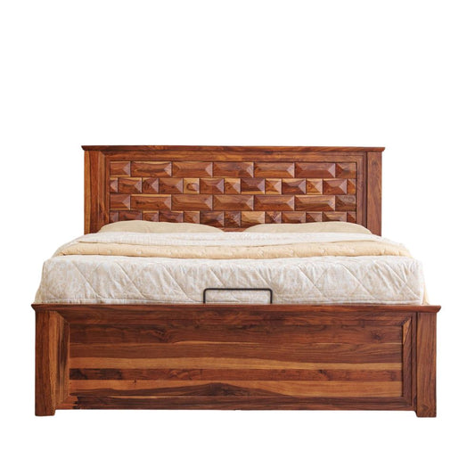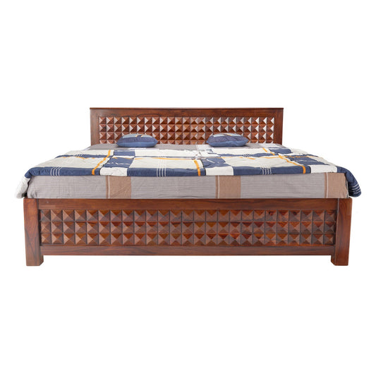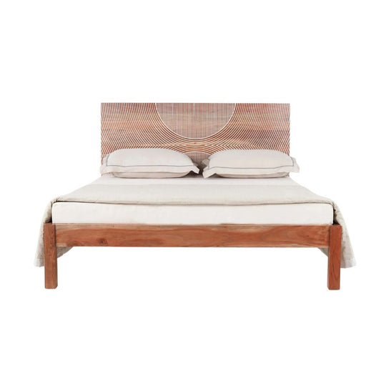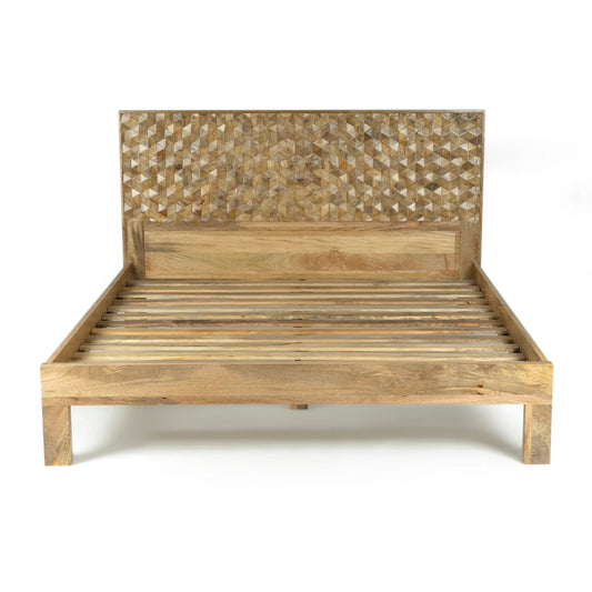 Solid Mango Wood Bed with Handcrafted Geometric Headboard – Natural Finish Wooden Double Bed Frame