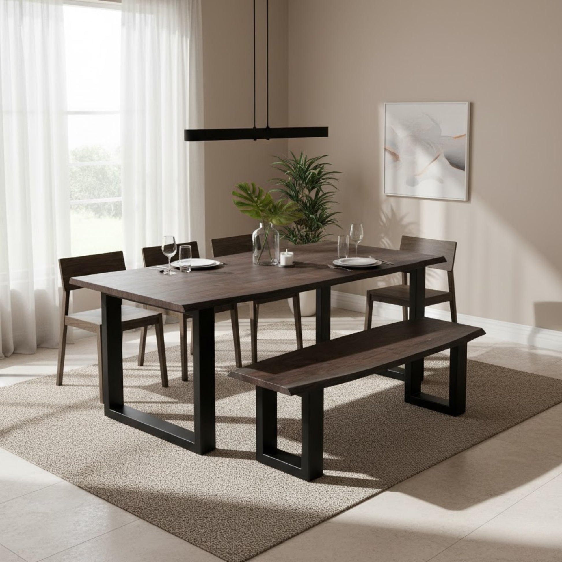 Introducing our exquisite wooden and iron dining table with bench set, a perfect blend of modern design and rustic charm. This set features a robust wooden tabletop that showcases the natural grain and texture of the wood, providing a warm and inviting atmosphere for any dining space. The sturdy black metal legs not only offer exceptional stability and durability but also add a contemporary edge to the overall aesthetic. The accompanying bench complements the table beautifully, allowing for flexible seating arrangements and making it ideal for family gatherings or entertaining guests. This dining set is not just a functional piece of furniture; it is a statement of style that enhances the decor of your home while providing a comfortable dining experience.