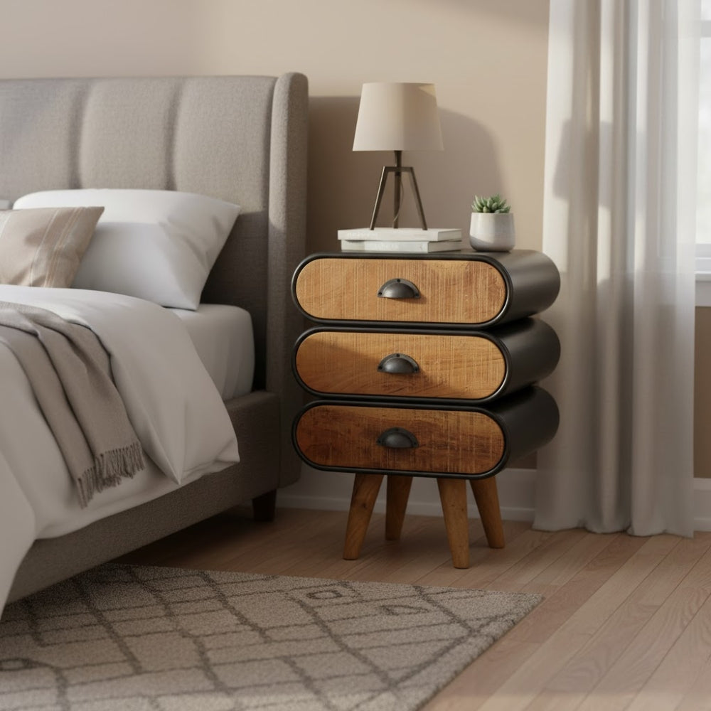 Mid-Century Modern Indo Iron 3 Drawers Drawer Chest This sophisticated drawer chest combines mid-century design principles with masterful Indo-iron construction. Three capacious drawers offer ample storage for textiles, accessories, and personal items while maintaining an understated aesthetic. Intricate iron detailing reflects generations of Indian metalworking heritage, paired with streamlined proportions that suit modern interiors. Engineered for stability and longevity, each drawer operates smoothly for daily convenience. A versatile storage solution that serves as both functional furniture and an artisanal focal point in bedrooms, living areas, or entryways.